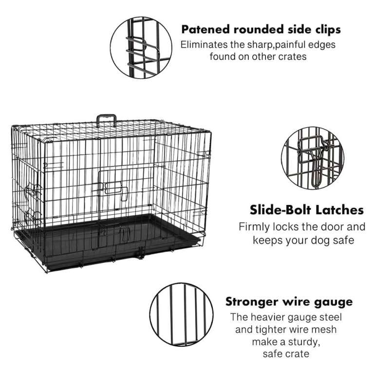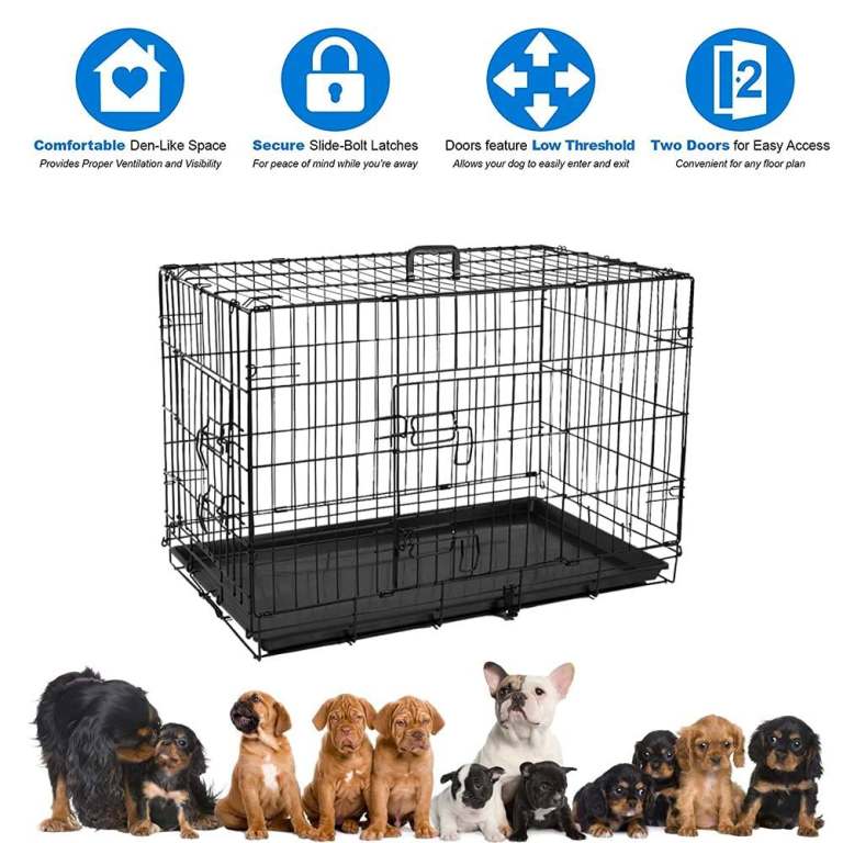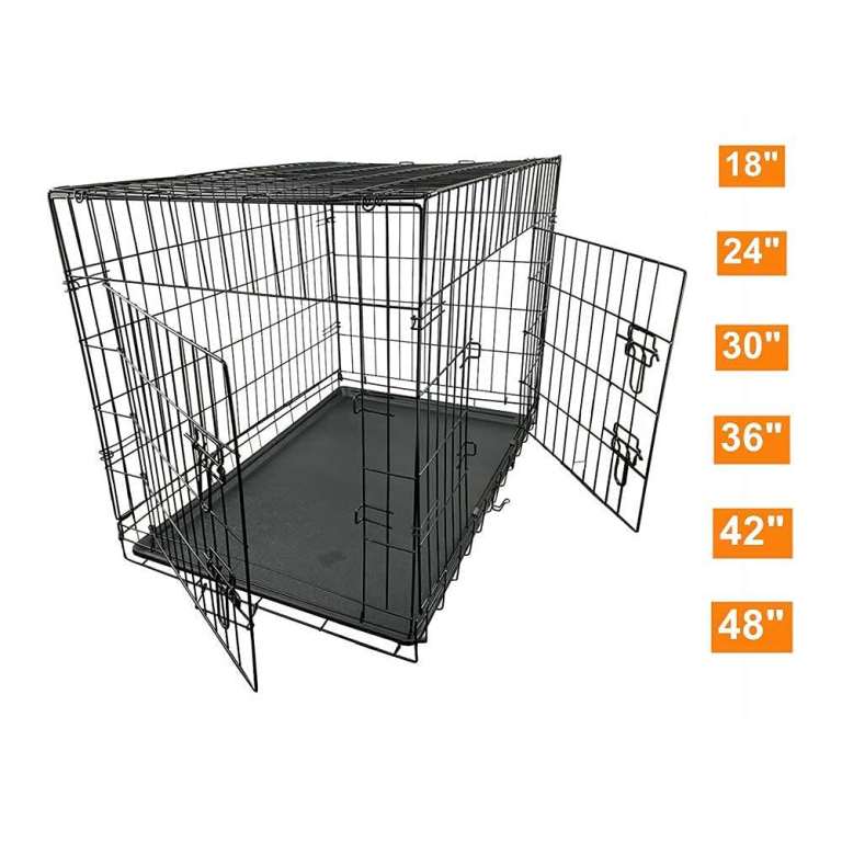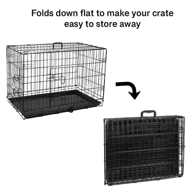 24 inch black folding metal crate with 2 no lockable doors, removeable plastic bottom tray and Carrier handle.