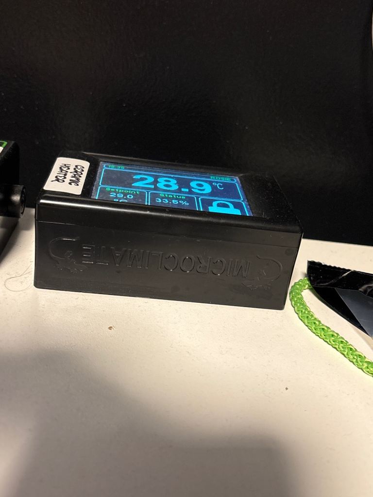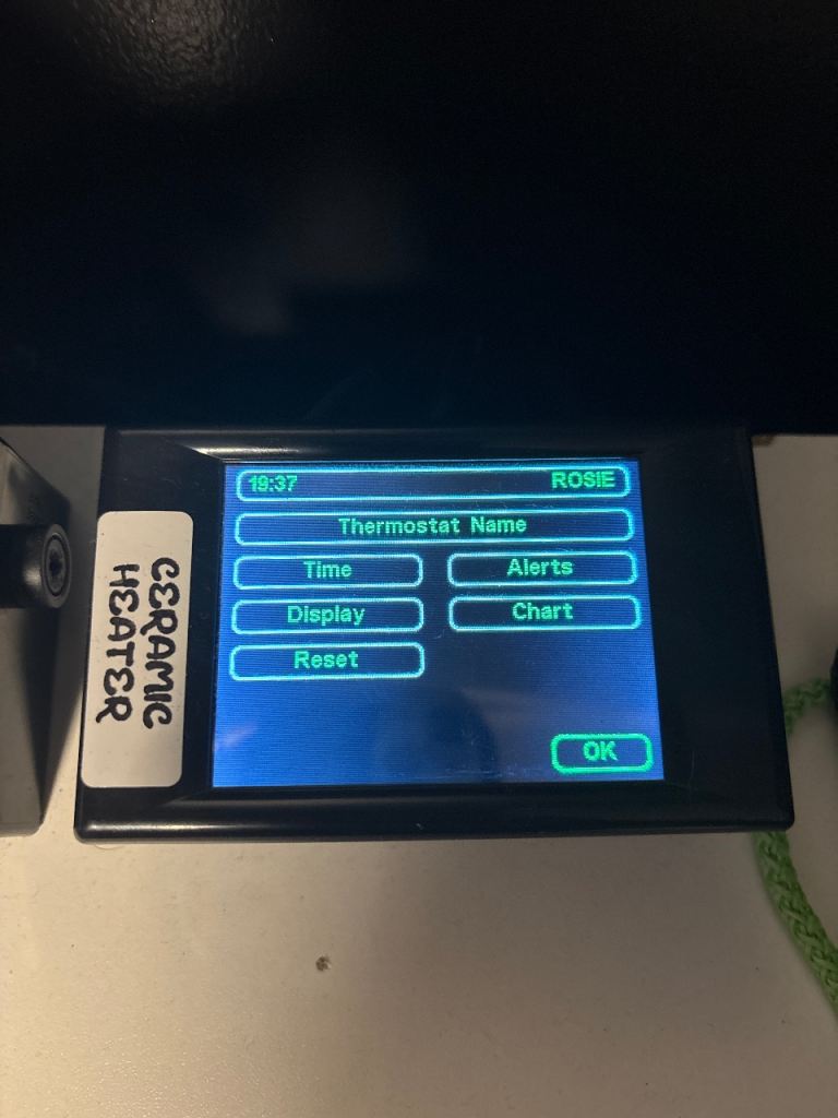 Evo thermostat (controlling the ceramic heat emitter day and night) this is a great thermostat with lots of functions (dimming, pulse and on/off, also able to set day and night temperatures) and loads more functions compared to standard thermostats.