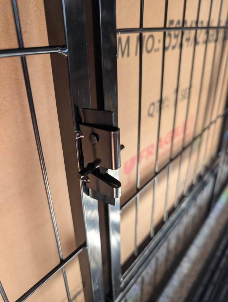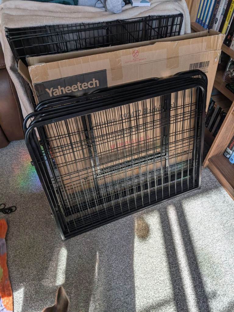 Used but still fully functional. There are a few scratches where the black coating has worn off, and a couple of the connecting pins are slightly bent this doesn't affect use at all. Selling as our dog has outgrown it. Perfect for indoor or outdoor use! Original packaging (box available)