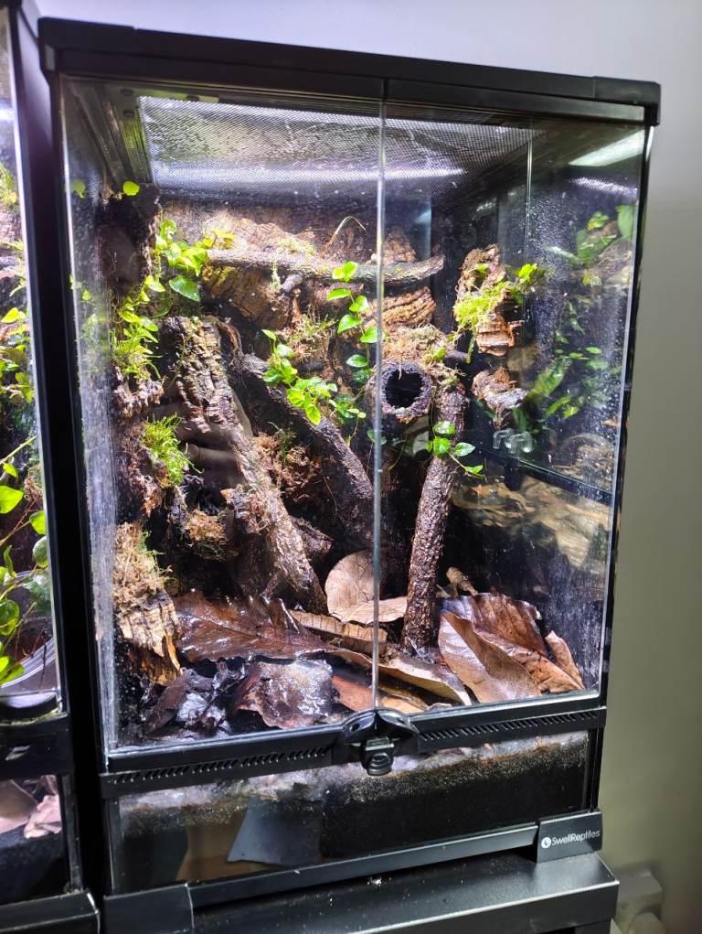 Comes with cork background, and 3D cork pieces added for extra climbing spots, with live spaghnum moss and ficus pumila (creeping fig).
