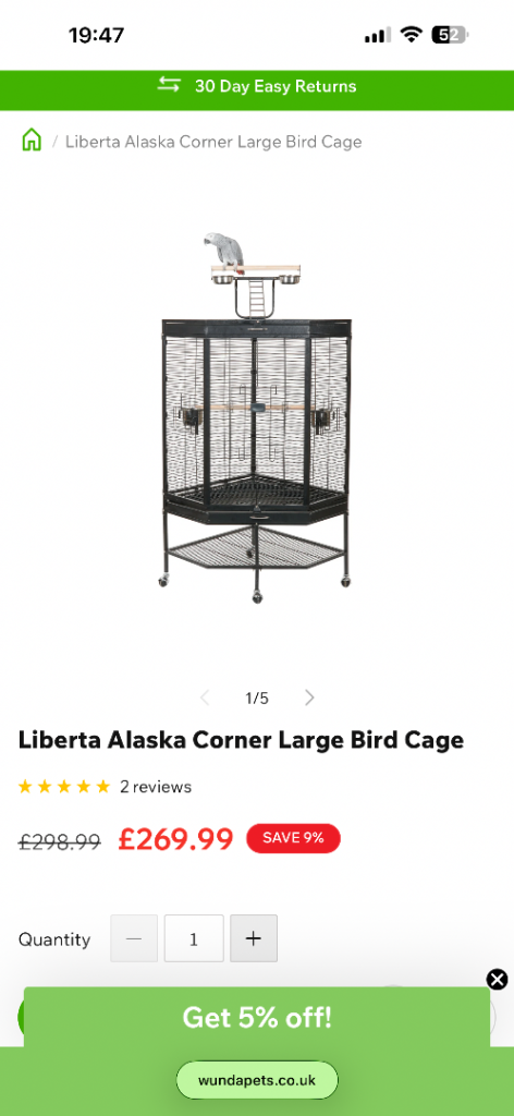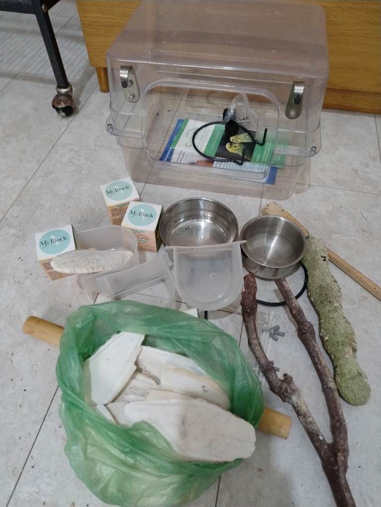One big cage suitable for all kind of birds.Only 3 months used. It can be reopened while being carried. With a bunch of accessories. Like standing stick, food and water bowl, minarel block, Cuttlefish bone etc.