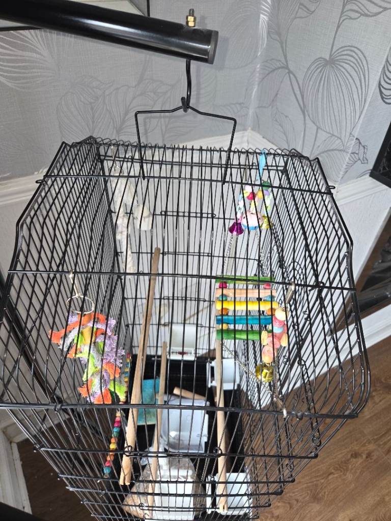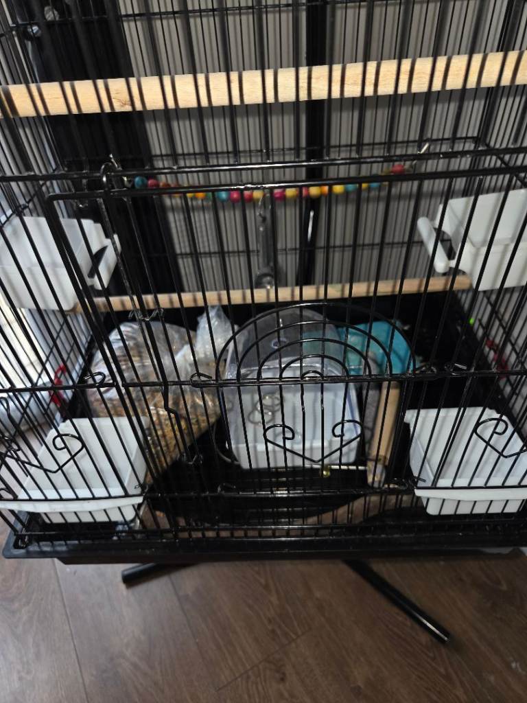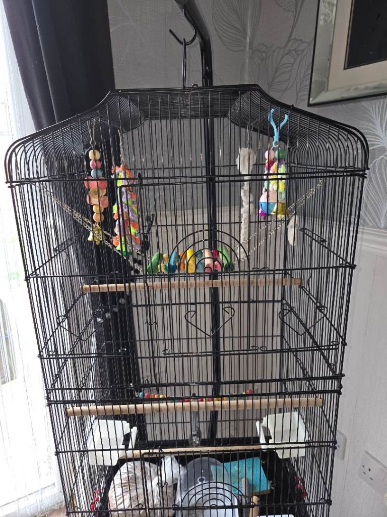 Black Bird cage an stand, like new, only 6mths old, Bird bath, accessories, toys and full bag of food.