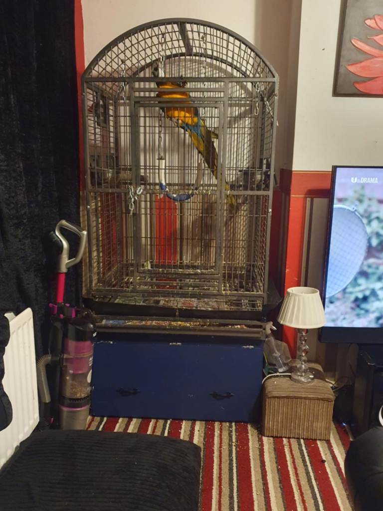 large bird cage blue only used twice on stand with wheels to move around easy