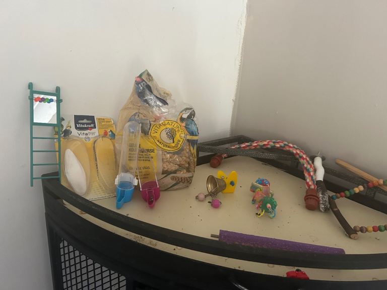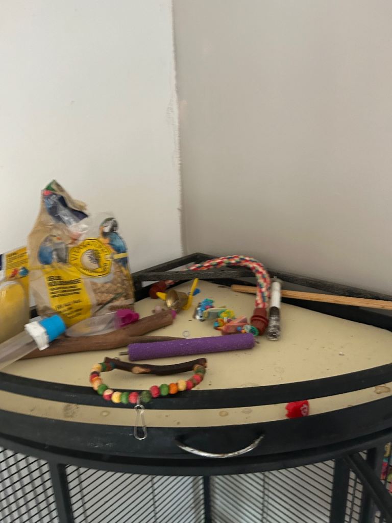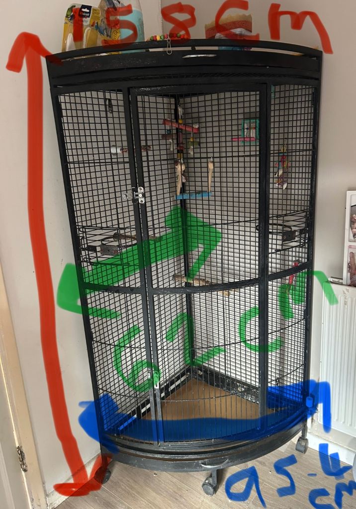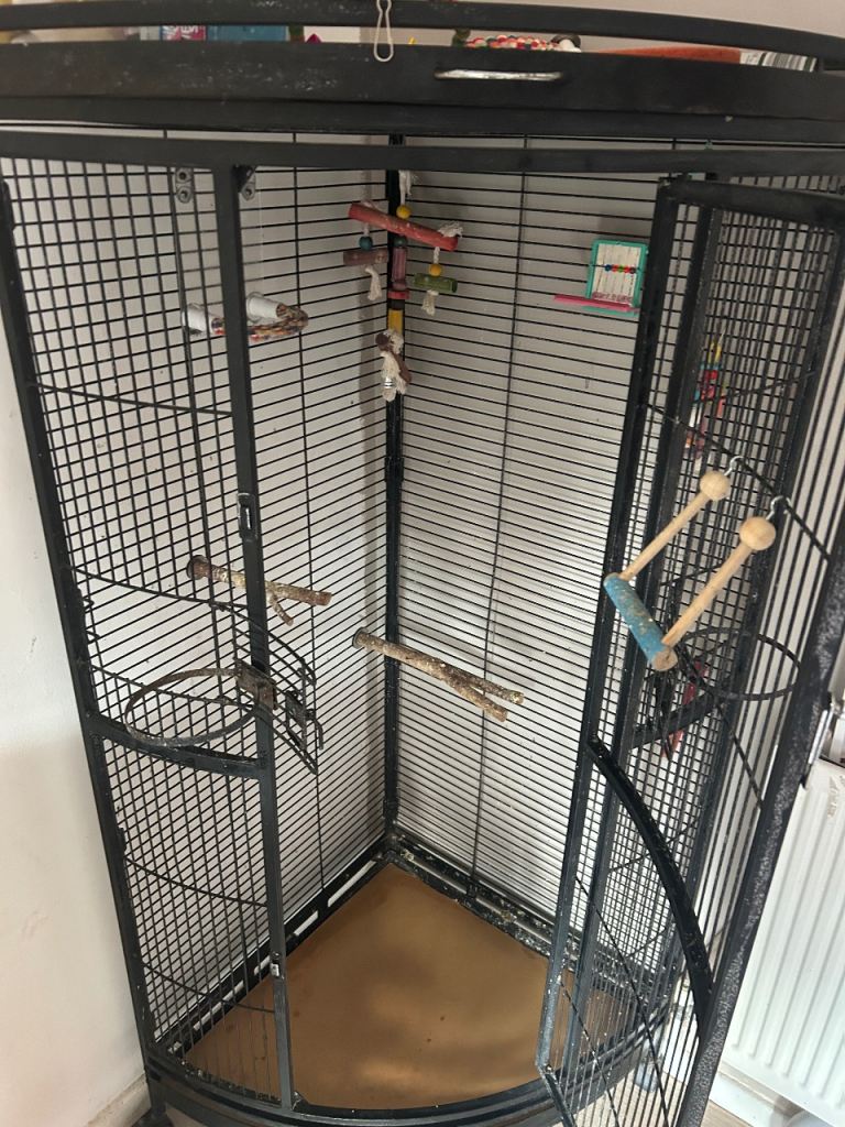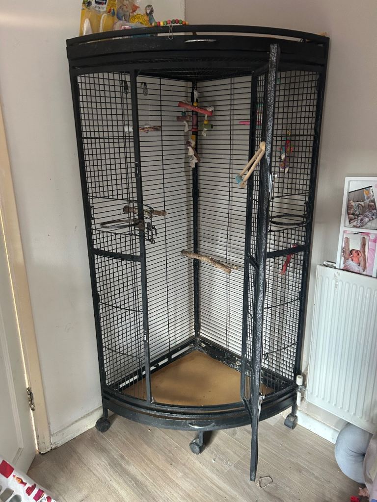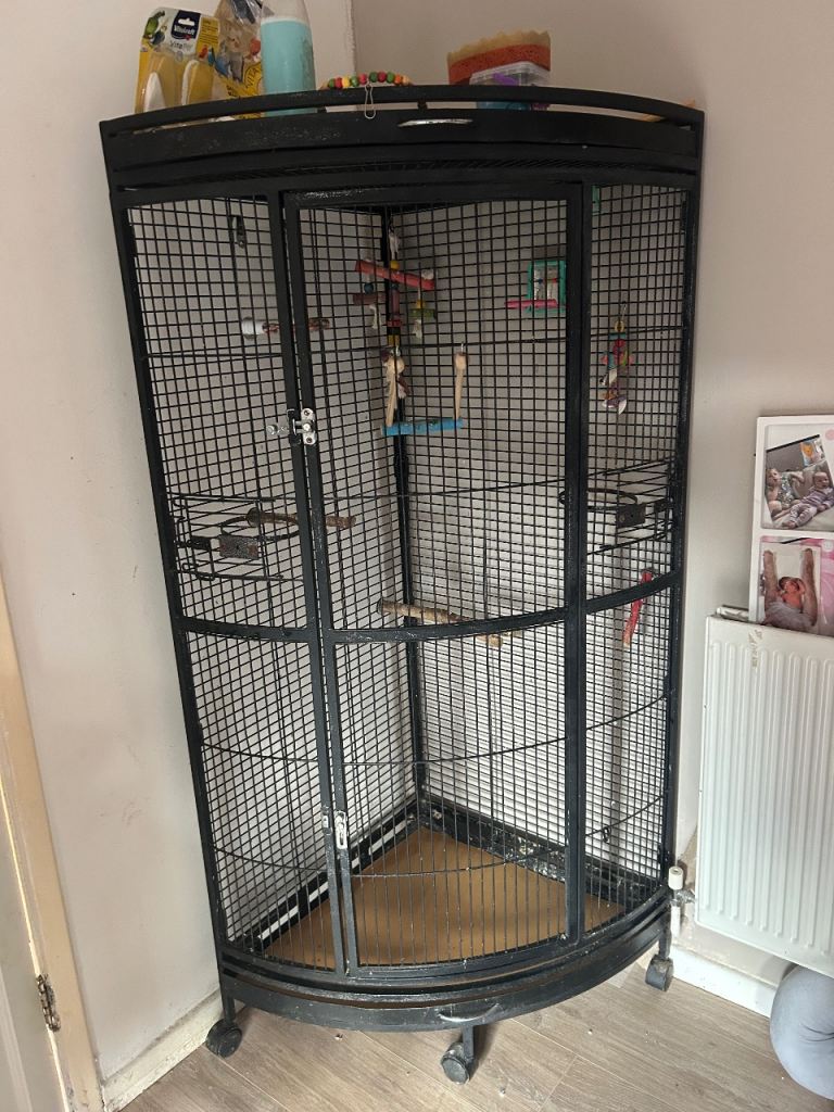 Large corner space saving cage looks lovely and fits in the corner nicely comes with extras please see pictures for the extras will all be cleaned before sold