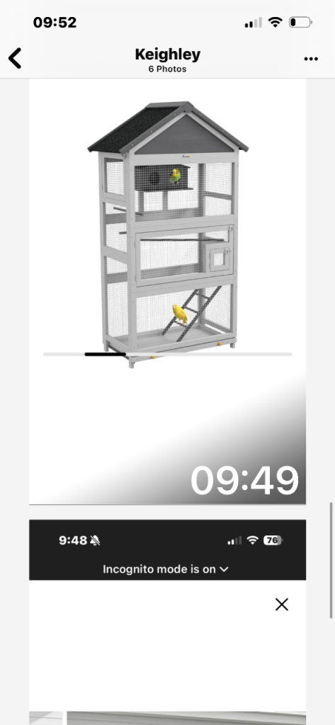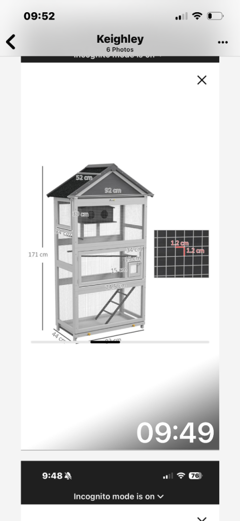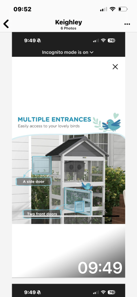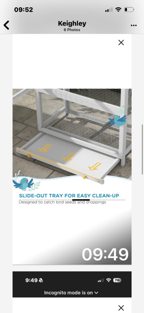Brand new never been assembled , too big for our bird and can’t return it . All new in box