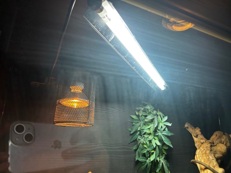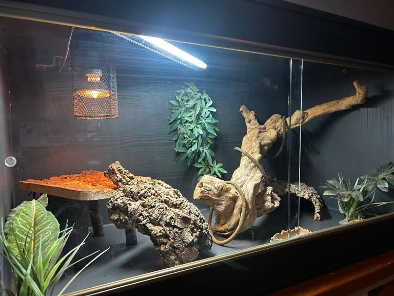 Black vivarium, comes with every thing inside, plus a brand new thermometer/heat lamp bulb, and uv light that have just been changed . Size : L. 1200mm x H. 620mm x W. 620mm