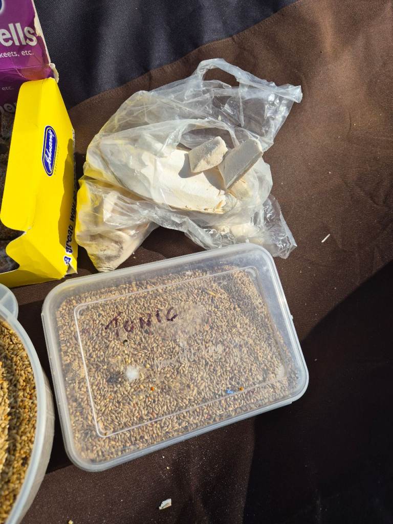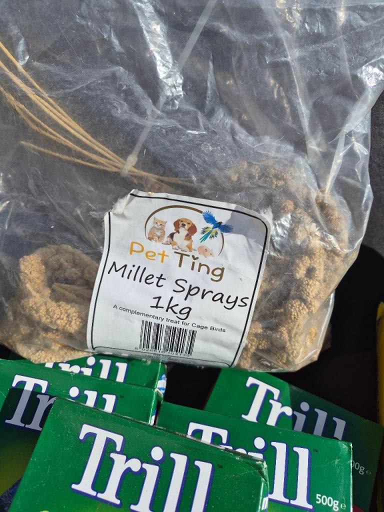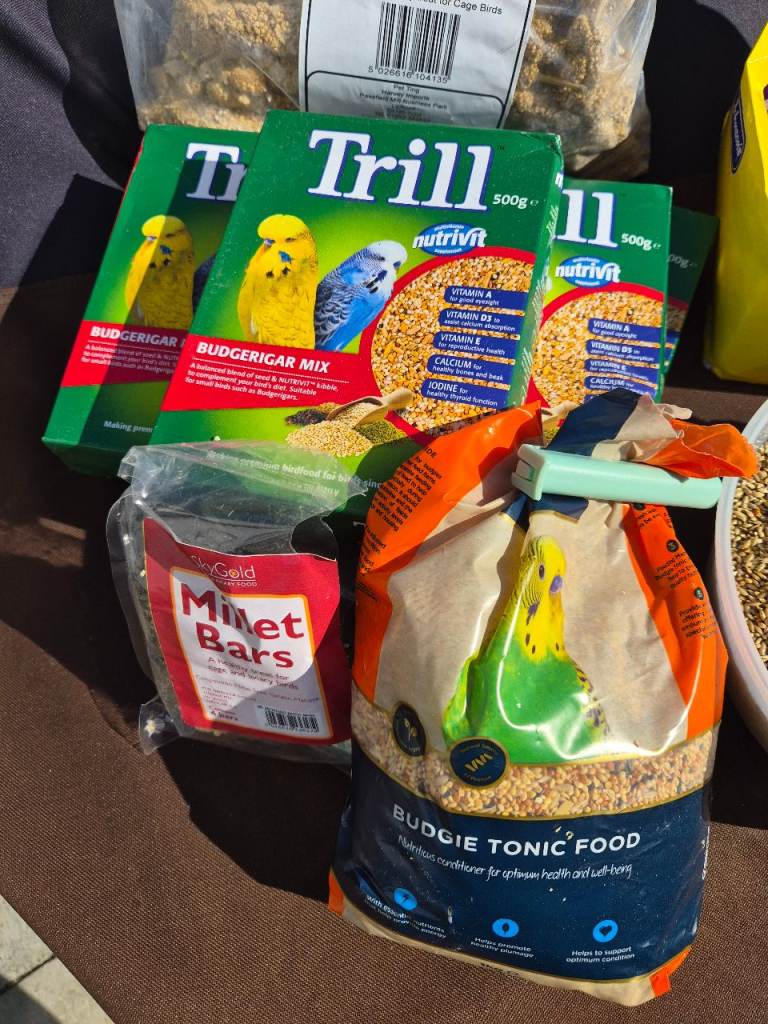 A large selection of budgie food including 22 seed bells, lots of millet, various seed mixes, treats, cuttle fish bones and 5 boxes of trill (o.o.d.). Collection only.