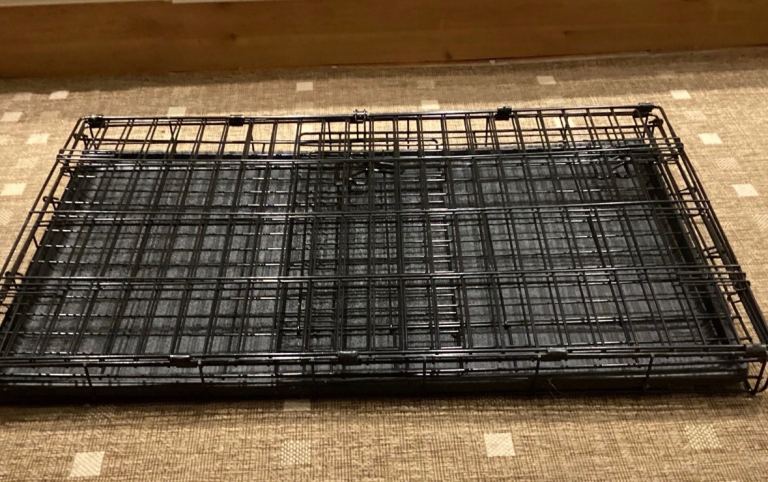 USED DOG CRATE, METAL WITH PLASTIC TRAY MEASURES