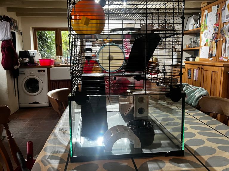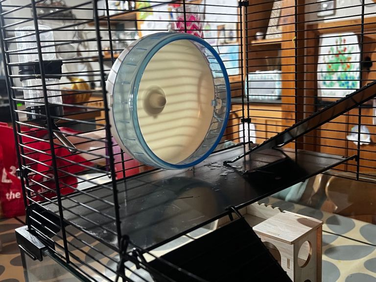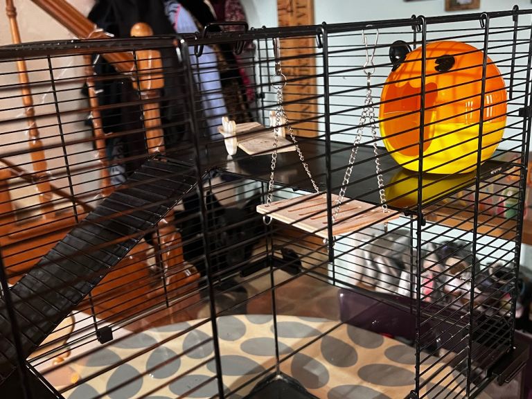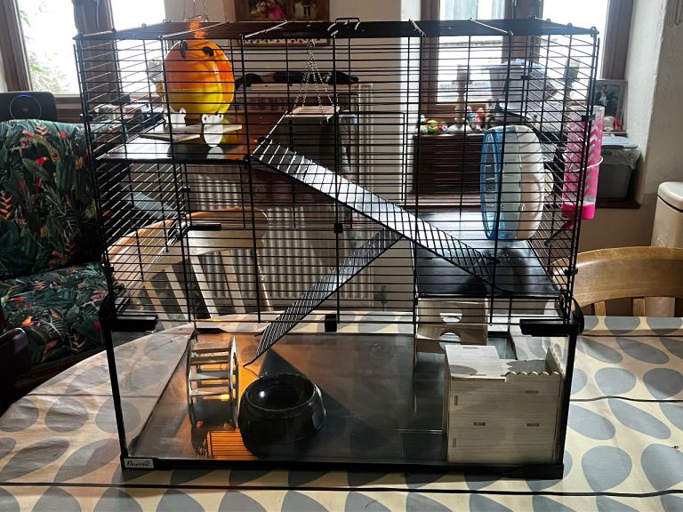 Split across three different levels, accessible by ramps this cage offers a good amount of space and lots of things to keep small pets stimulated. Including a wheel, a wooden castle, see saw, swing, bridge and climbing frame.