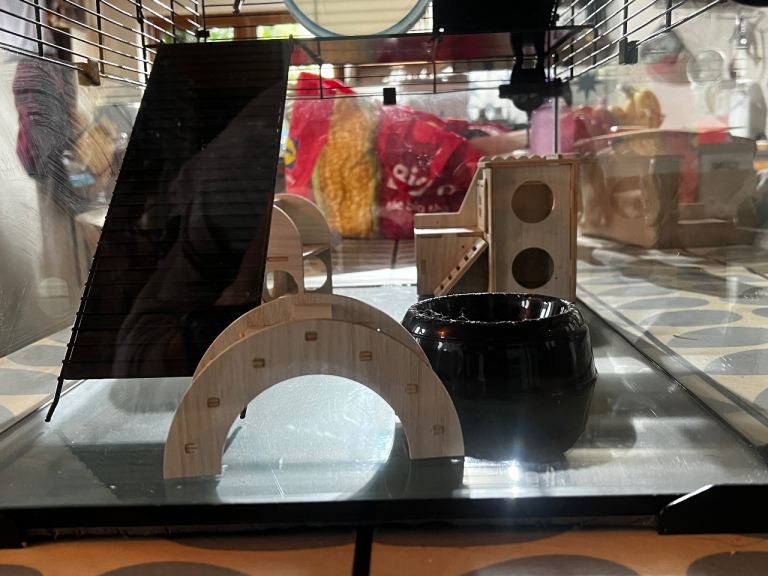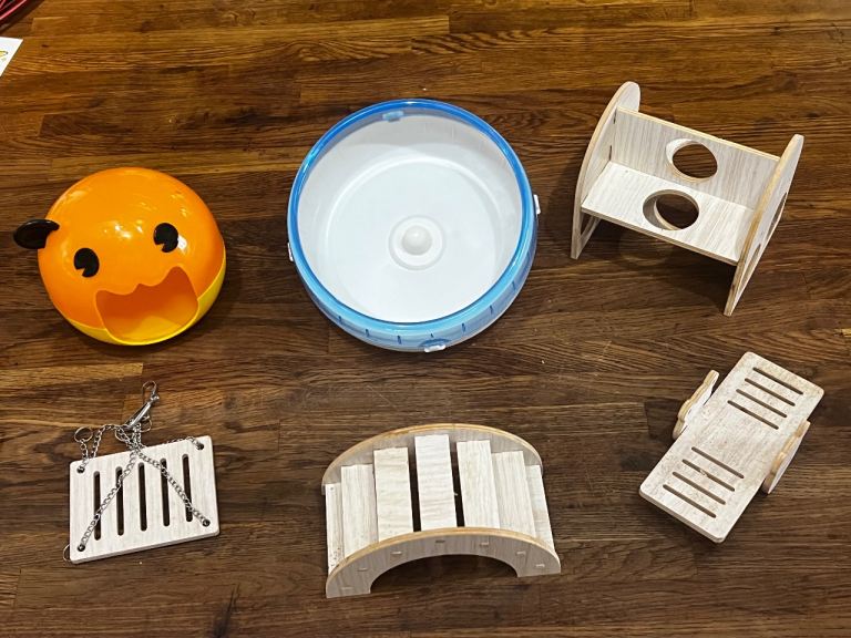 It also has a bedroom hut, food bowl, two water bottles and a food storage tub.