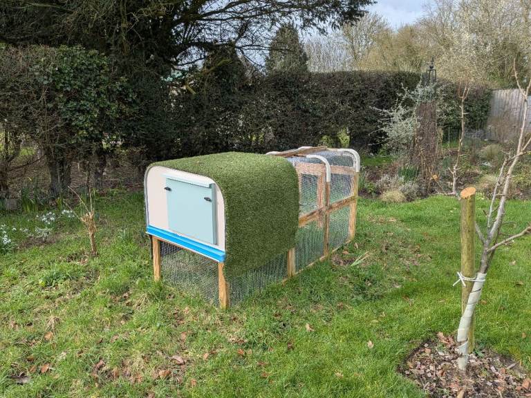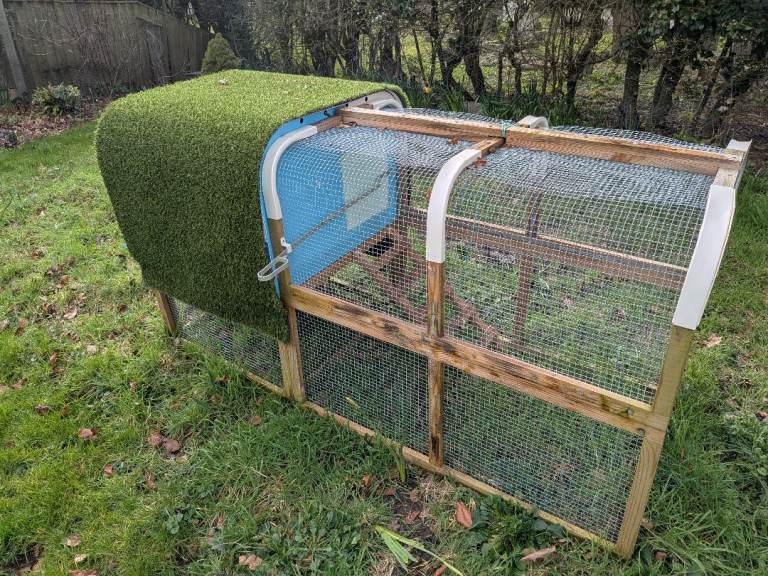 As new chicken coop with run attached, the hut is all plastic with slid out tray for easy clean, easy to move round garden, space for up to 6 bantams or 4 hens, cost £300
