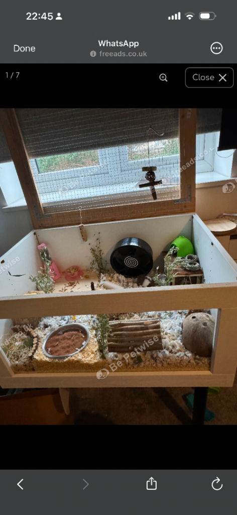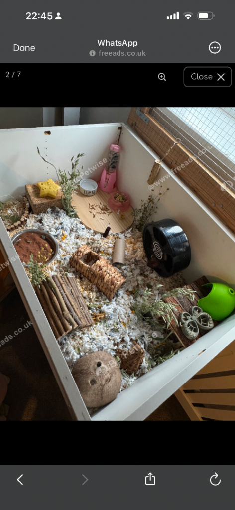 IKEA diy hamster cage from cabinets. Includes wheel, some chew toys, small hide, bowls