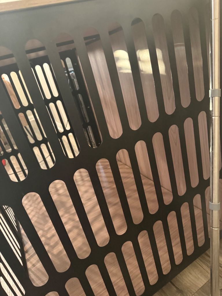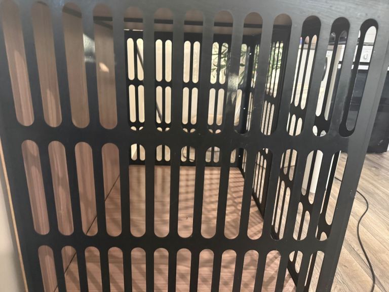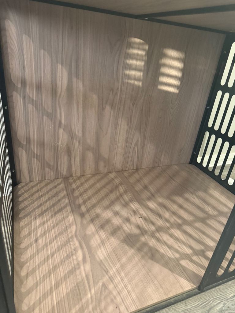 Black metal cage with wood top and inside