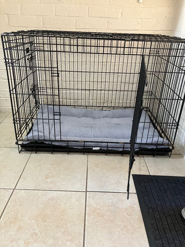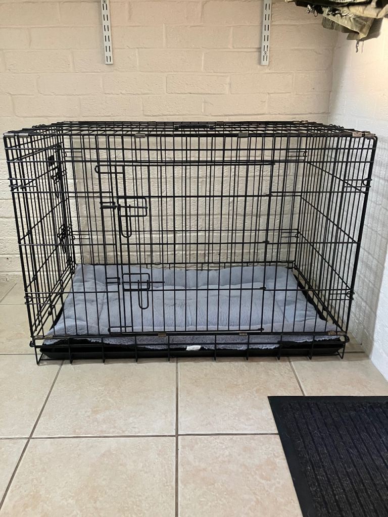 Medium size dog cage 65cm high 57cm wide 92cm long used but still good 2 doors. New bedding mat. Buyer to collect and cash only. £20 ovno.