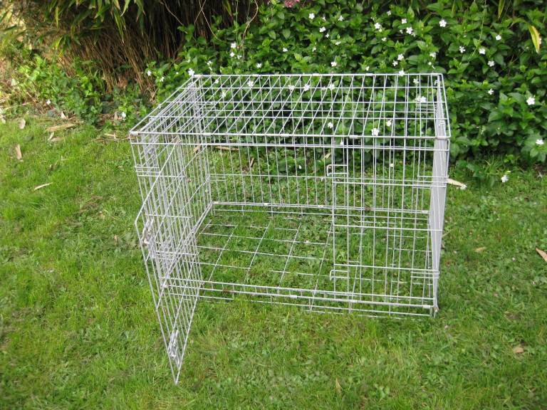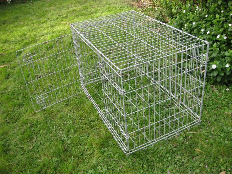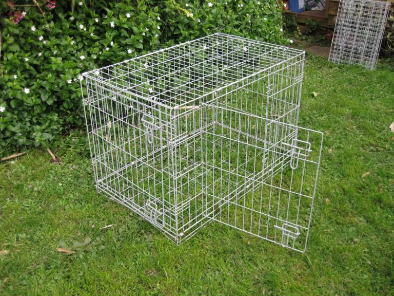 This is a strong wire cage suitable for a medium to large size dog. It measures 3 foot or 90cm wide, 23 inches or 58cm across, and 25inches or 63cm high. It has a front and side entrance, is in good condition, and is exactly as shown in the photos