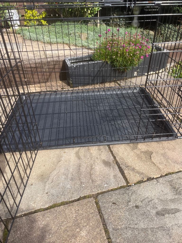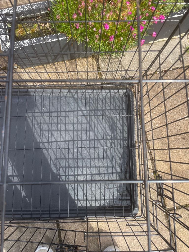 Black metal dog crate. Folds for easy transport. Removable tray at bottom. Great condition