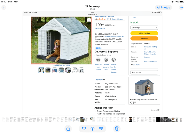 This dog kennel I used for my large husky. He loved it. It protects from rain and big inside. Easy to clean by hosing down . It is plastic so it doesn’t erode . I bought it for 200 pounds on Amazon and I am selling it it for 50 .