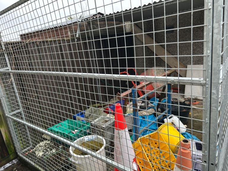 Dog pen (outdoor ) has only been used for storage. Double gate. Tin roof. Front 11ft and side 9 ft.