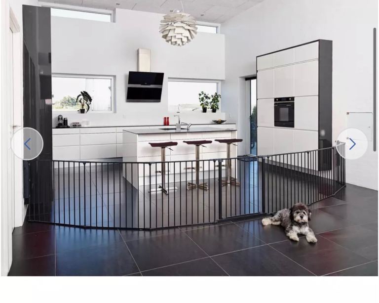 Metal Pet Pen with extra wide door section for easy access. Very easy to build and take down. All you need for the puppy pen is included in the box. The pen can be used as a room divider or safety gate covering 350cm. Wall fittings are included. Includes 5 sections including door section. Tested and approved EN12227:2010. Made in Denmark.