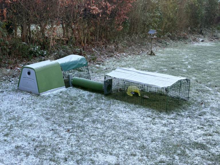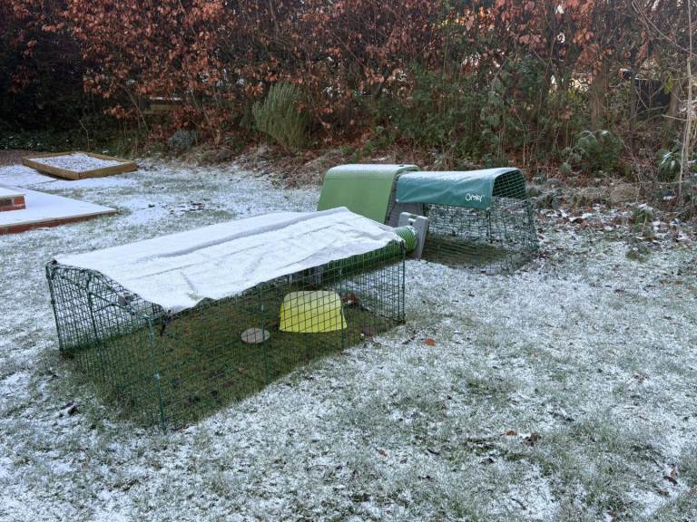 Eglu Go Hutch with attachments, run, heavy duty cover, zippi tunnel with connection kit, zippi single height run plus cover. Both runs have wire fox-resistant base.