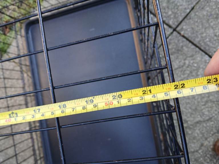 Double doors so your animal can access it from the front or side. Only used several times when I worked as a dog boarder. In very good condition, the only minor defect being slight rust on a few hinges, but this doesn't affect its usage. Folds flat for storage and transportation. Dimensions: length 35", width 22", height 25".Bought new last year for £90.