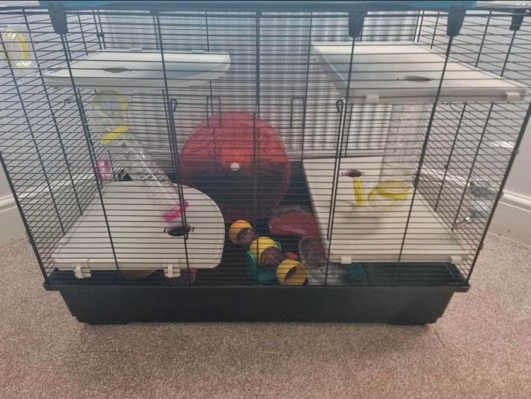 an extra-large hamster cage with plenty of space for them tohave adventures this cost £136. You need something like this to keep yourhamster entertained some more info: Cage for hamsters Vertical structure on several floors, it encourages play and movement Modular habitat: ready to be connected to other rodent cages or hamster habitat modules Sturdy painted metal mesh Corner supports and fixing clips for great solidity Access doors equipped with safety locks Capacious bottom to contain dirt and litter Easy to clean cage Bottom and net can be separated by releasing the hooking tabs Accessories included: 1 drinking bottle, 1 feeder, 1 bowl, 2 tube sets, 4 shelves, 1 hamster wheel Space-saving packaging ECO-SUSTAINABLE: made of recycled plastic and iron