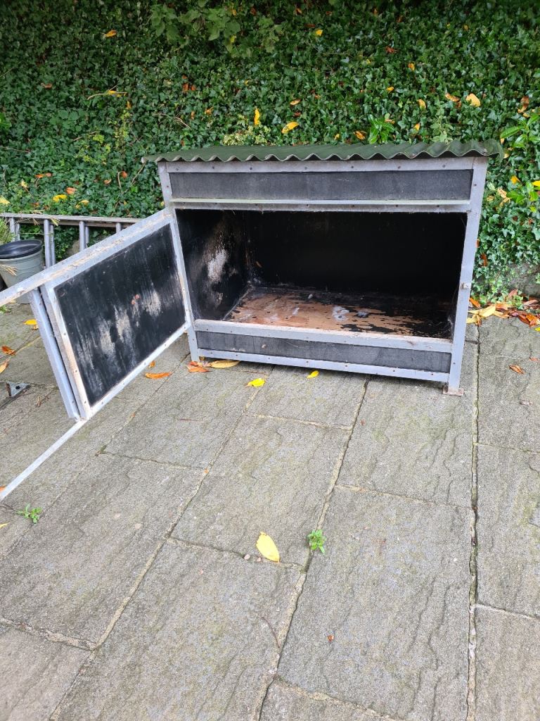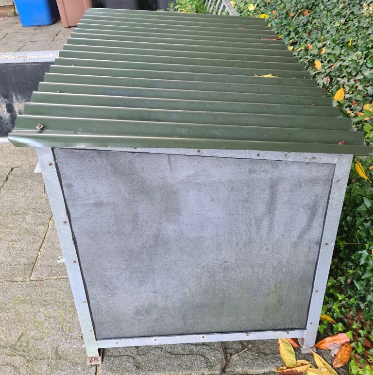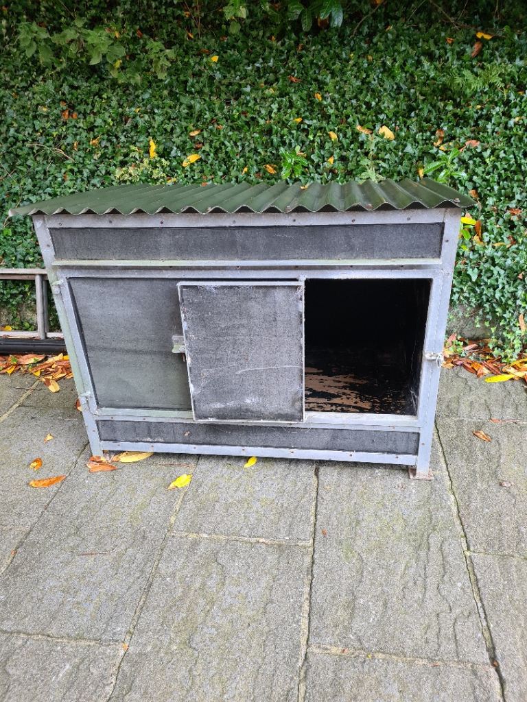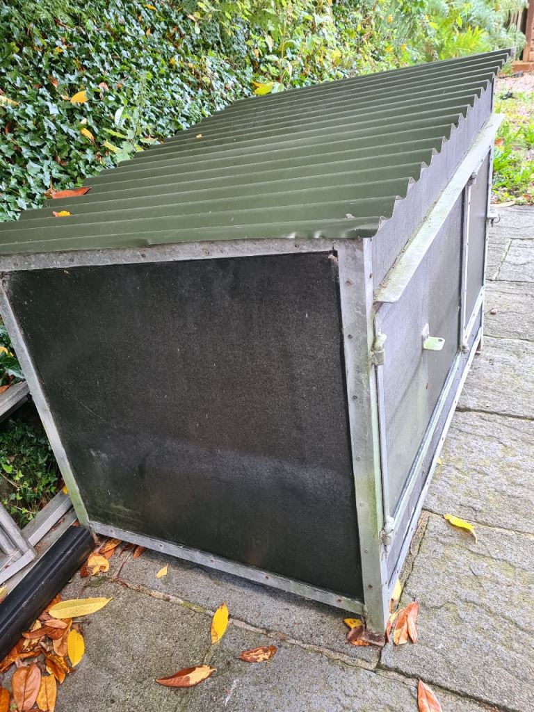 Galv steel frame kennel, corrugated metal roof and sealed plywood panels.