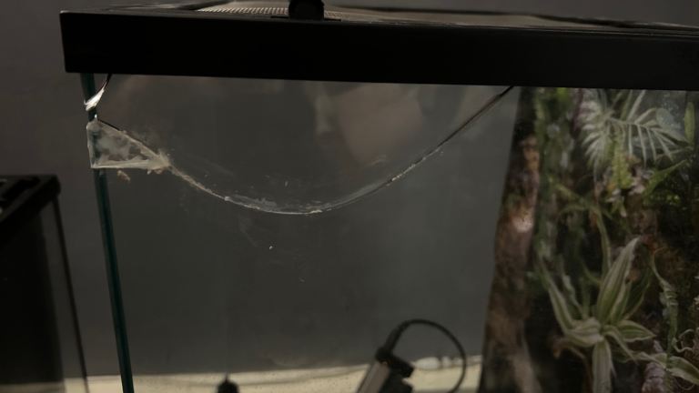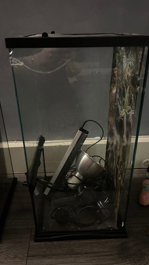 Crack on side of enclosure, still fine to use for a gecko will not cause no issues comes with heat lamp and light included