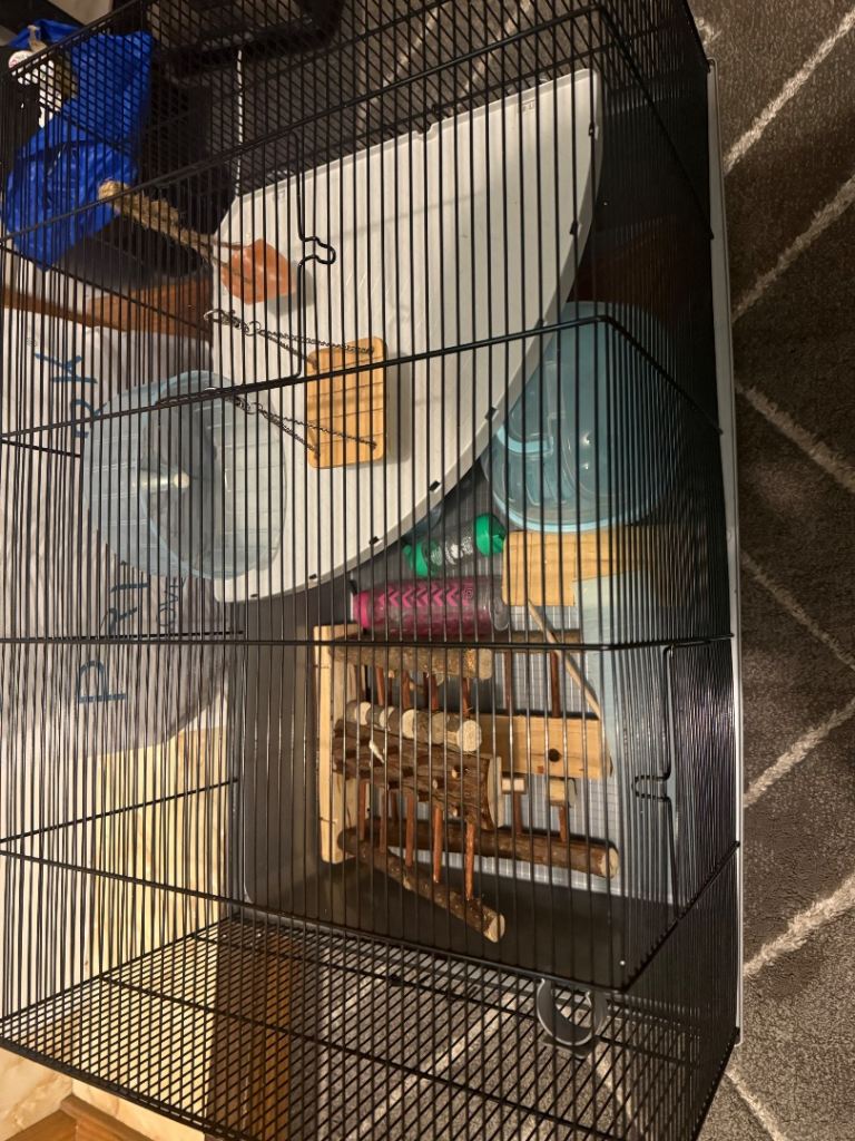 Large hamster cage with plenty of space, includes a Lacto water bottle, small feeding bowl, and additional accessories. Clean and in good condition. Perfect starter setup for a hamster.
