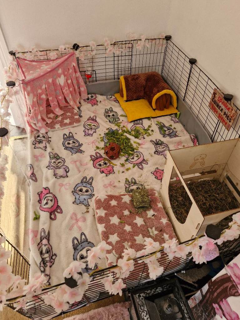 Lovely large guinea pig enclosure made with c&c grids and 3 perspex panels you get approx 36 c&c plus 3 perspex all connectors you can make it to your size as will be dismantled fof collection also included lots of fleeces canvas storage boxes loads of waterproof pads for under fleece,corner tunnel corner fringe hammock comfy small pee pads x 6 corner hay box and water bottle its an absolute bargain
