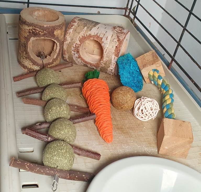 Fully intact cage with a large set of accessories. Cleaned and disinfected. Original bottle and shelf support are missing, but alternatives are included.