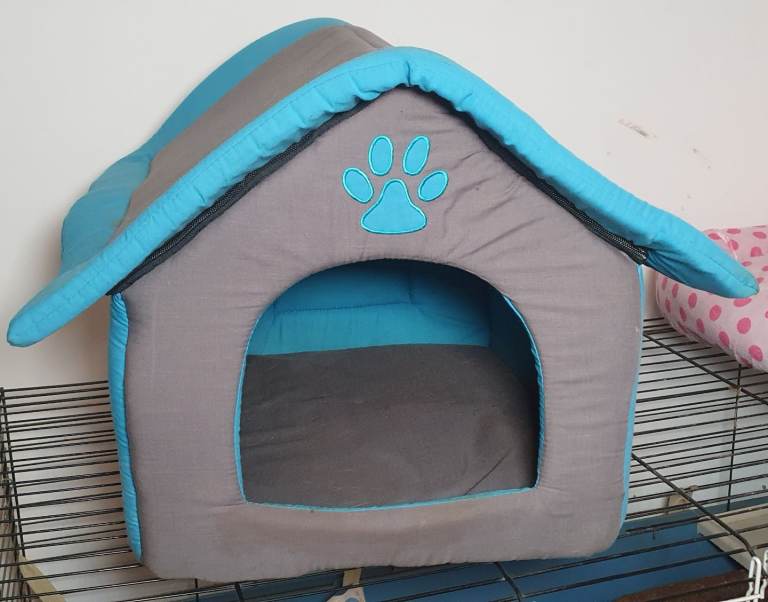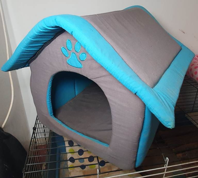 Two cat beds: one cushion-style freshly machine washed; one lightly stained fabric house.