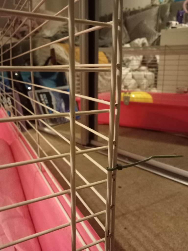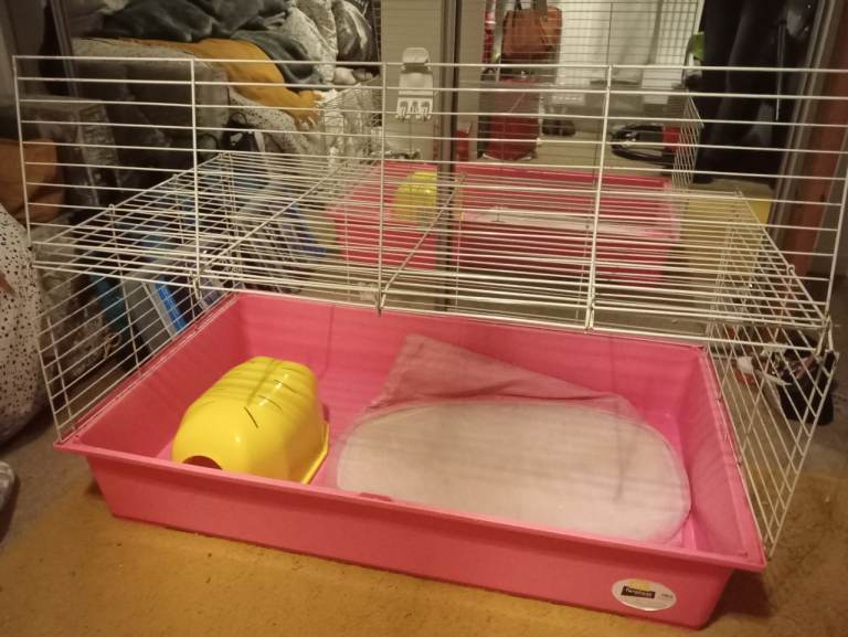 I'm selling my guinea pig cage due to a death. It has worn shown in the images in the bottom of the cage however the cage has been thoroughly disinfected due to selling. The cable ties shown in the image helps sturdiness of the cage as it fits perfectly on the ledges. The cage is cracked in one corner however this doesn't effect the quality. My guinea pig was perfectly safe in this cage and never escaped. It will include a Guinea pig play pen and a Guinea pig house. The house has worn shown around the edges however it is still in good use to be used. Collection only from foxhill s6