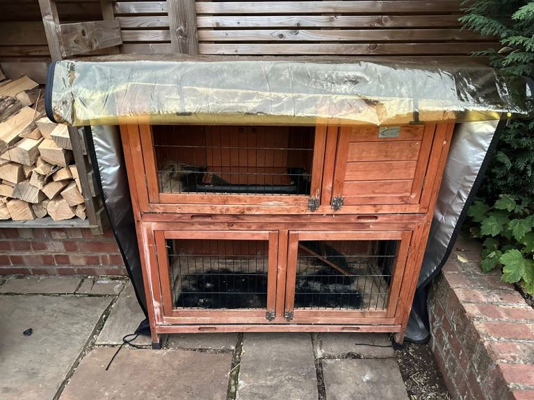 Hutch for guinea pigs or rabbits. Rain cover included with no rips. Hutch is well used but plenty of life left in it.