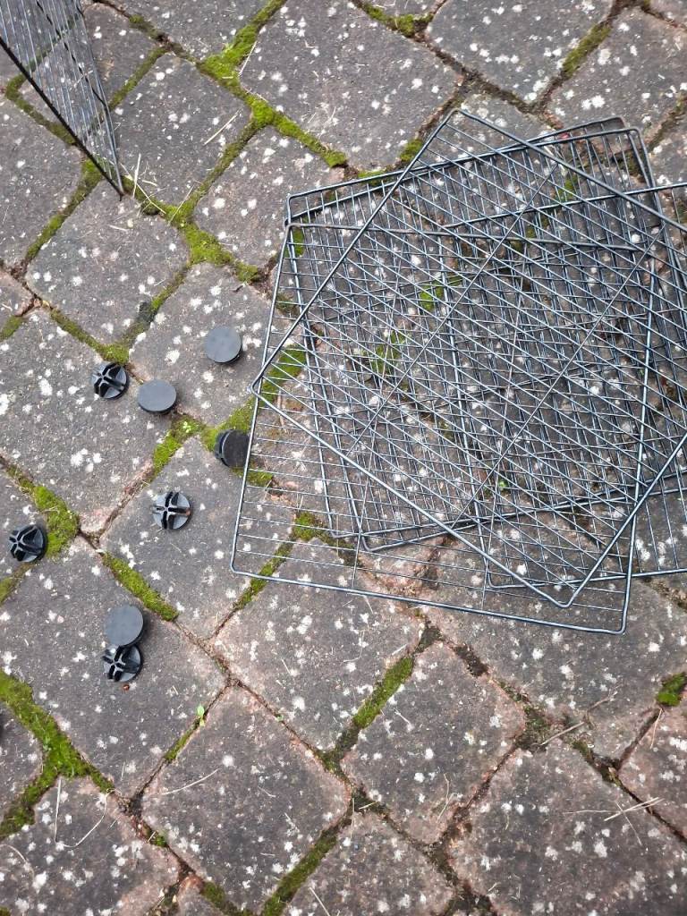 Grids and connectors for creating a guinea pig run. Seen here as an open run on top but can be made a smaller run and grids on top to create a lid.