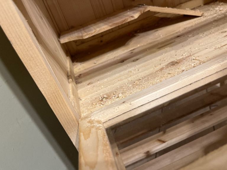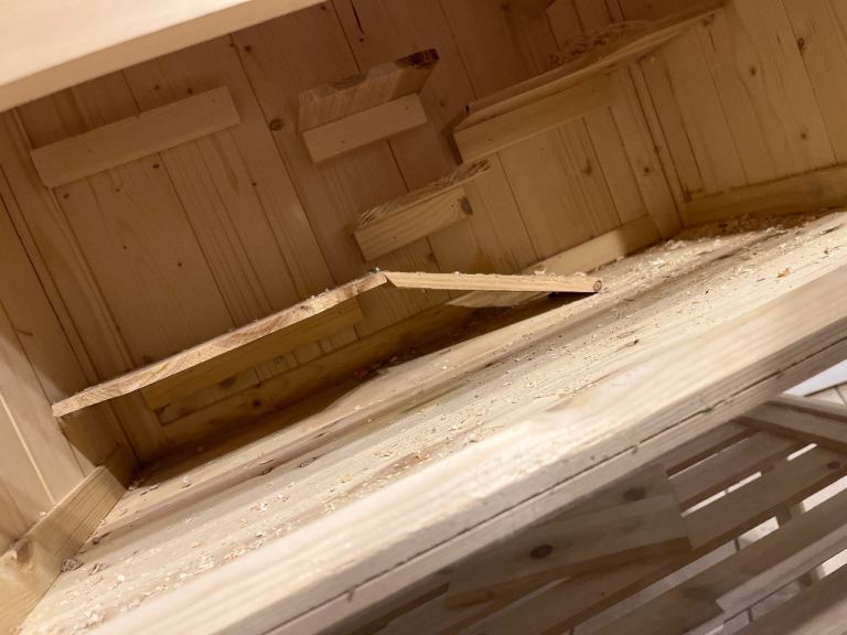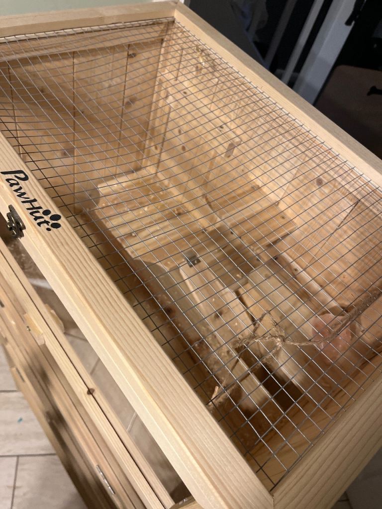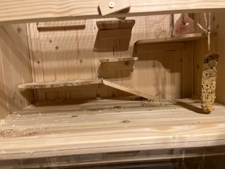 Wear and tear, few chew marks but still a really good cage. Wooden with two floors.