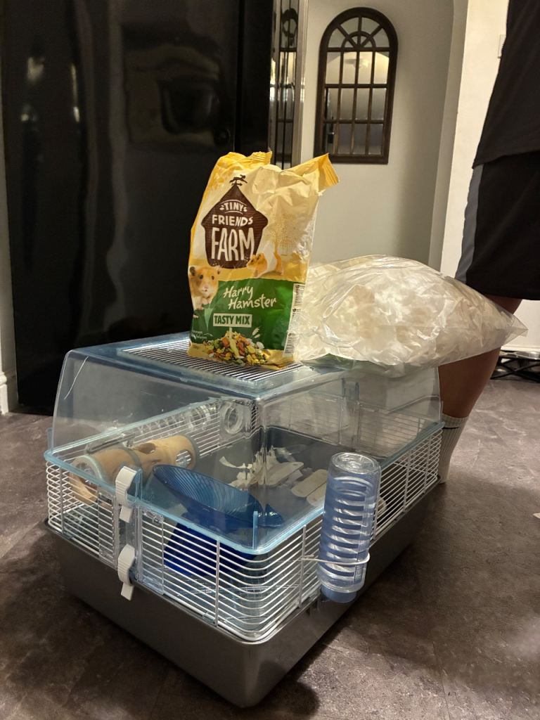 hamster cage for sale comes with bedding, water bottle, wheel, and tube