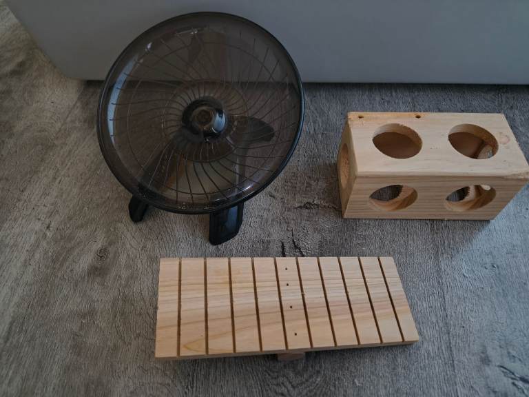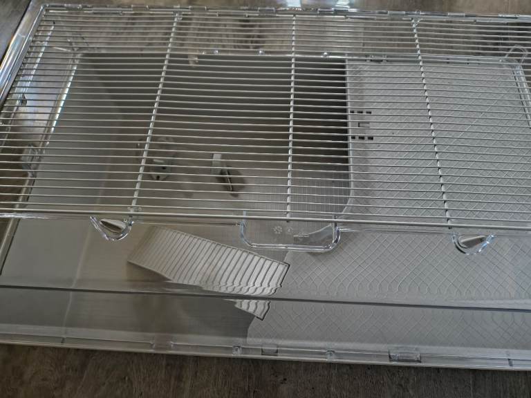 Hamster cage suitable for a couple of dwarf hamsters. Comes with water bottle, running disc, see saw and tunnel cube. All in excellent condition only a couple of months old. Too small for our Syrian hamster.