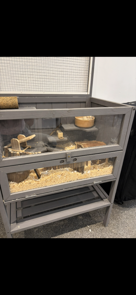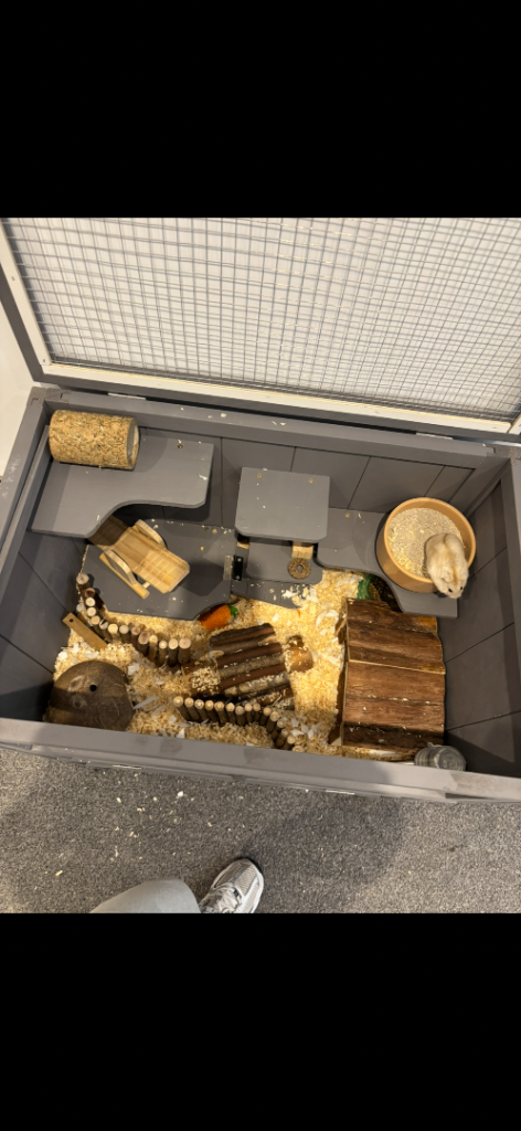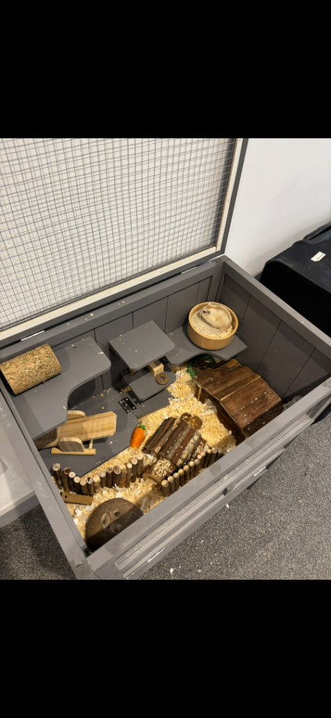 Wooden hamster cage with compartments, can take some of the stuff that’s in there aswell if wanted such as ceramic bowls, wooden house wooden sticks seasow bowls and more ACCEPTING OFFERS