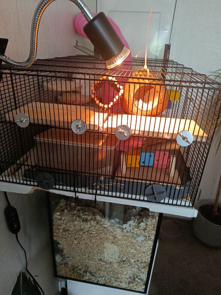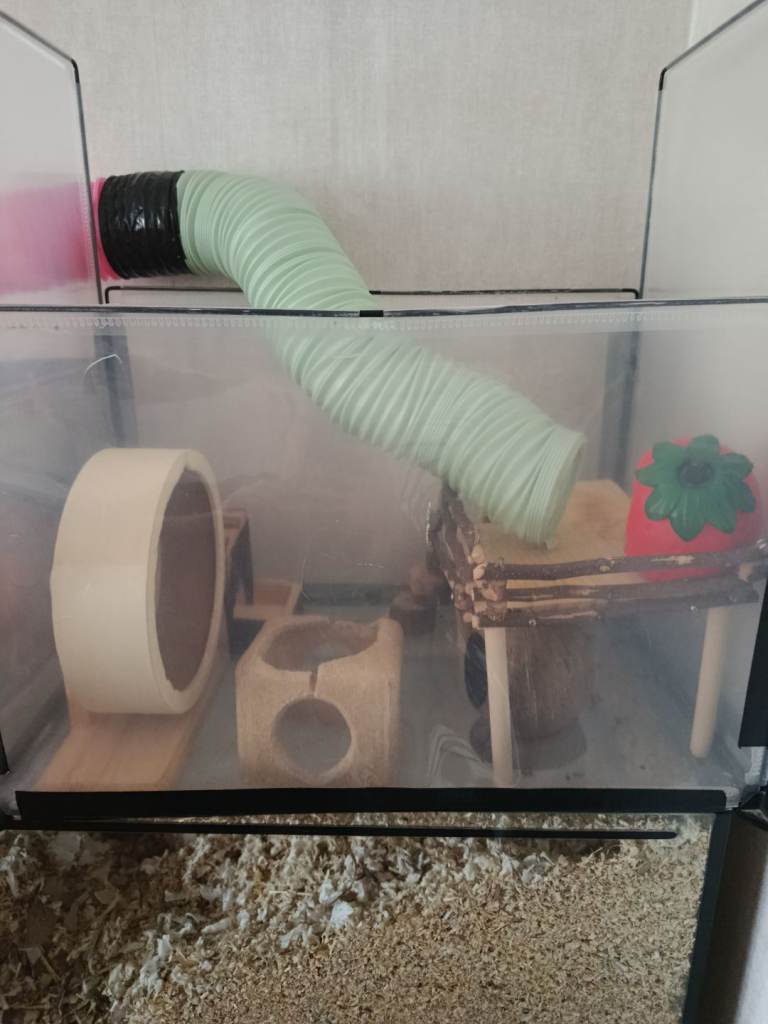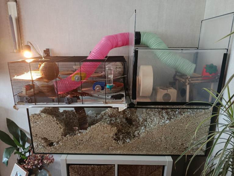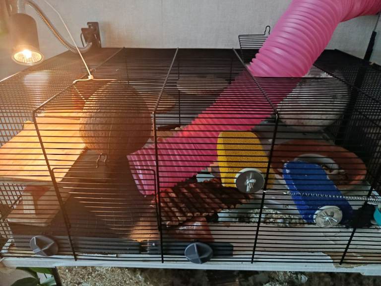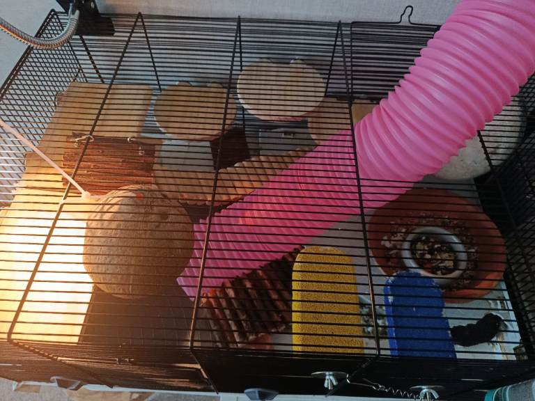 I used this cage for my two gerbils! Perfect set up for them, you will have everything you need and more! Hundreds of accessories, food, bedding, snacks list goes on! Didn't photograph accessories as theres too many but means you can swap things out and change it up for them! Also comes with a tank topper if your taking the top bits off to clean!