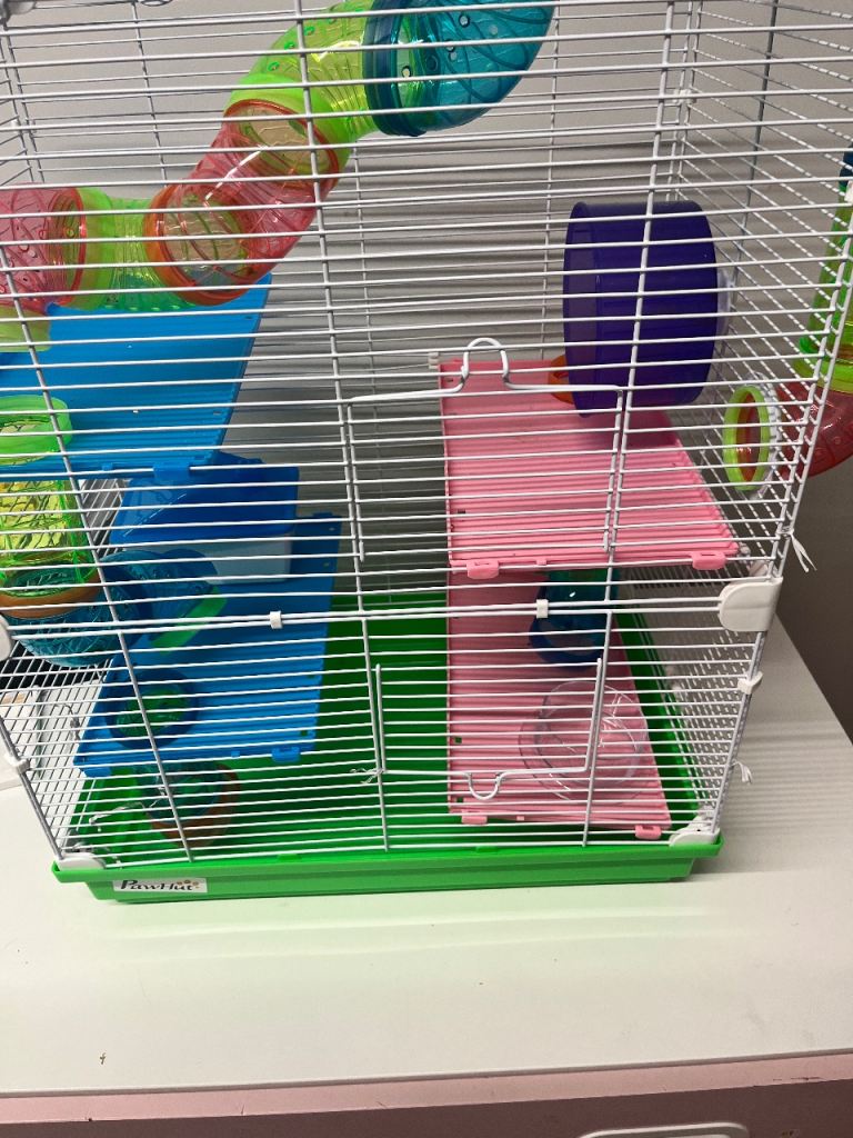 Hamster wheel with wheel, house, water bottle and feeding bowl. Great condition. We only used it for 2 weeks.