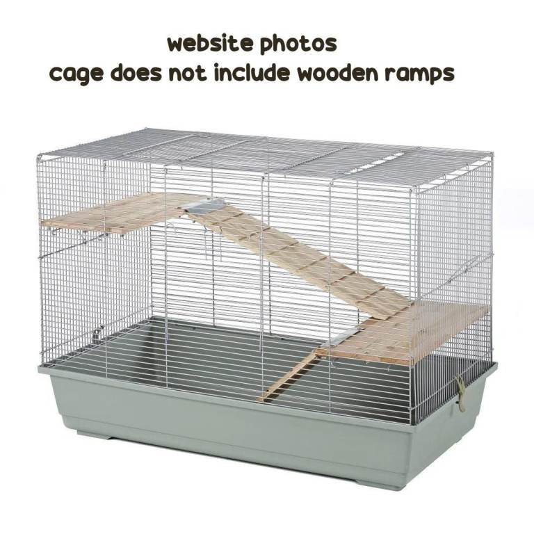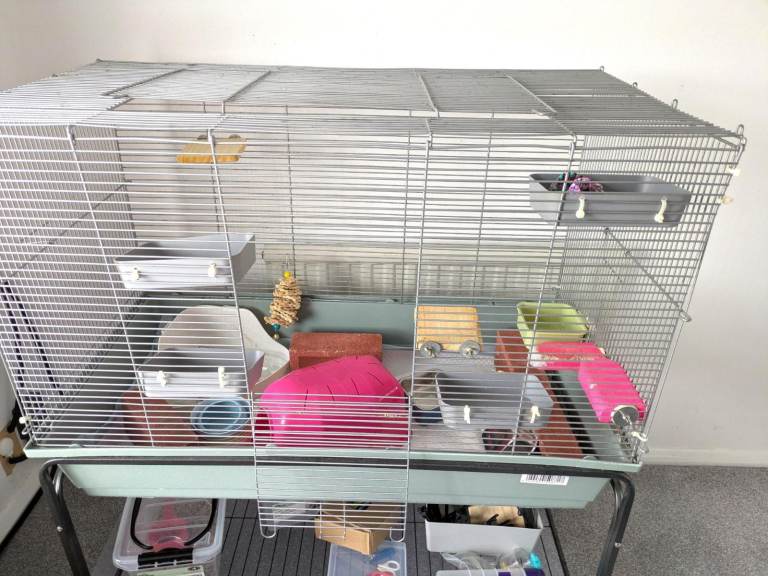 Large 100cm cage suitable for rats or hamsters, with matching stand included. This was used for my rats, who have since passed away, so everything is ready for a new home. The cage has some wear but is fully functional and suitable for adult rats.