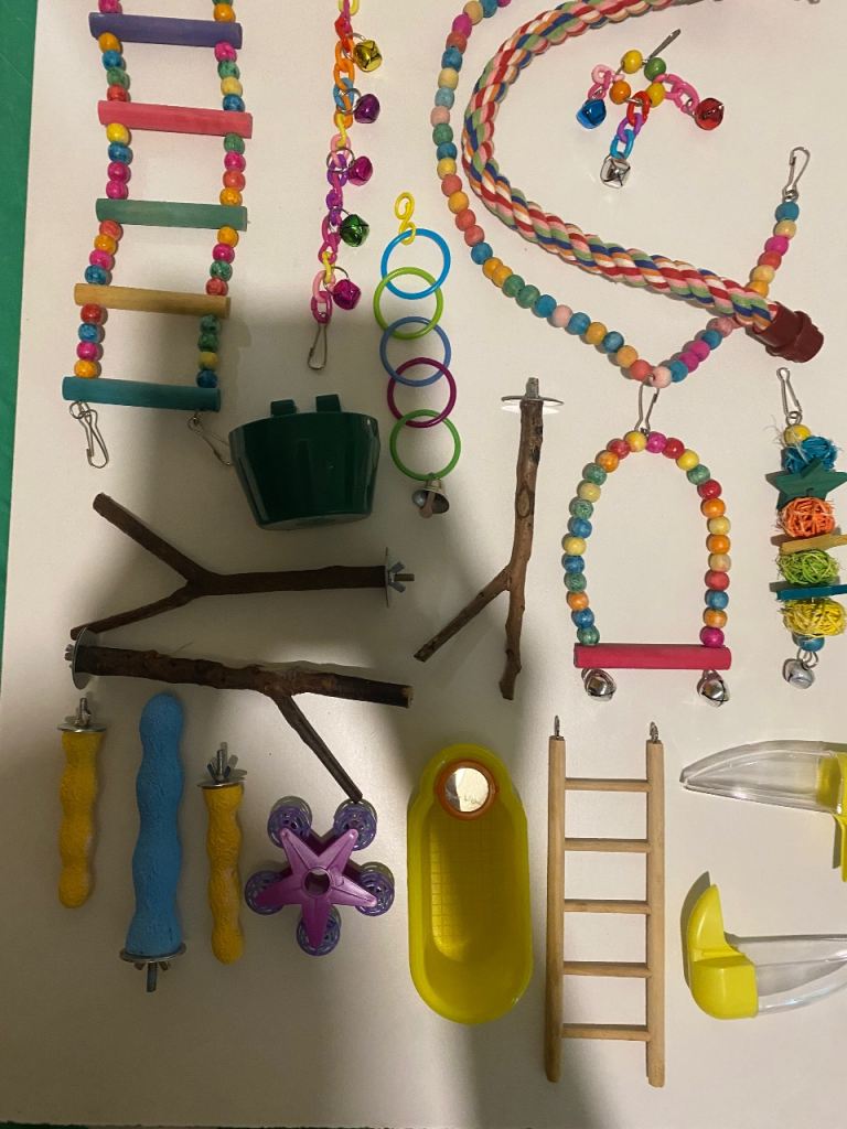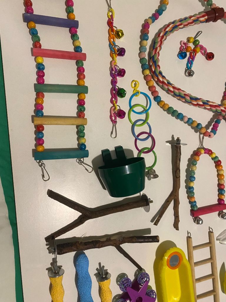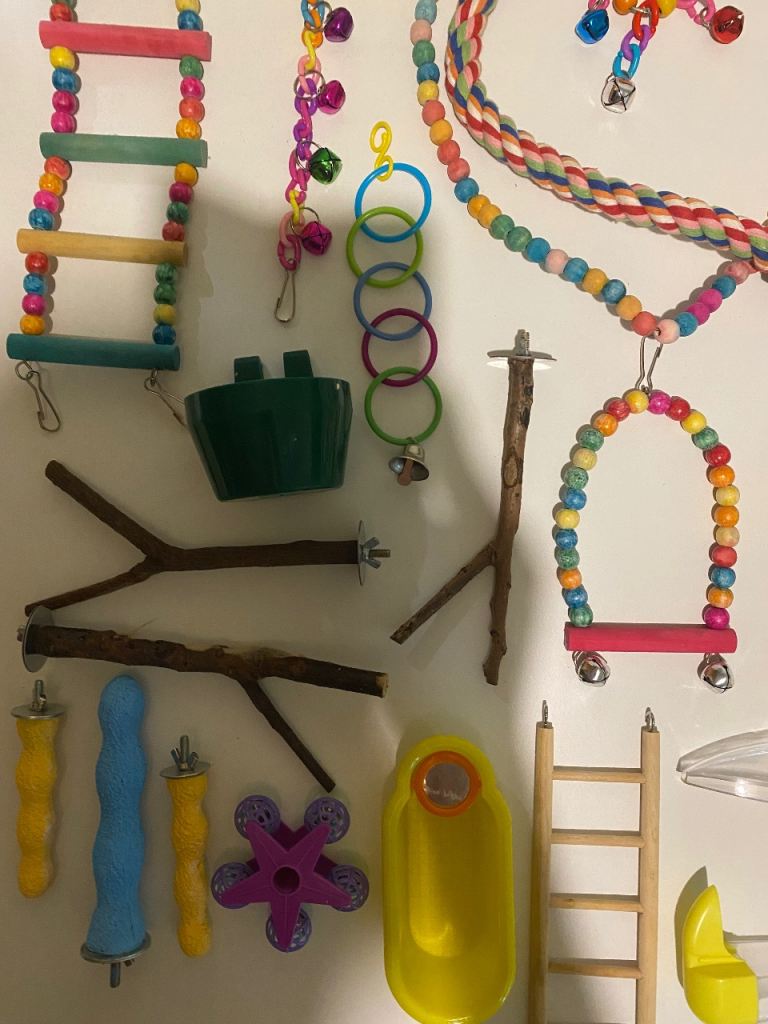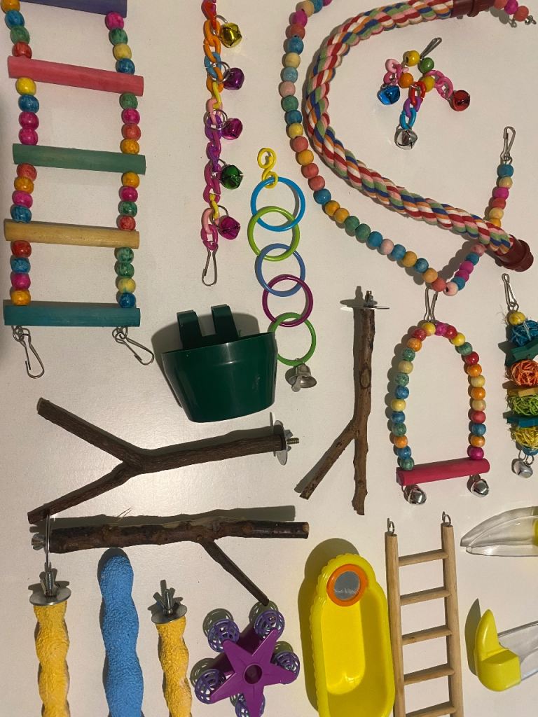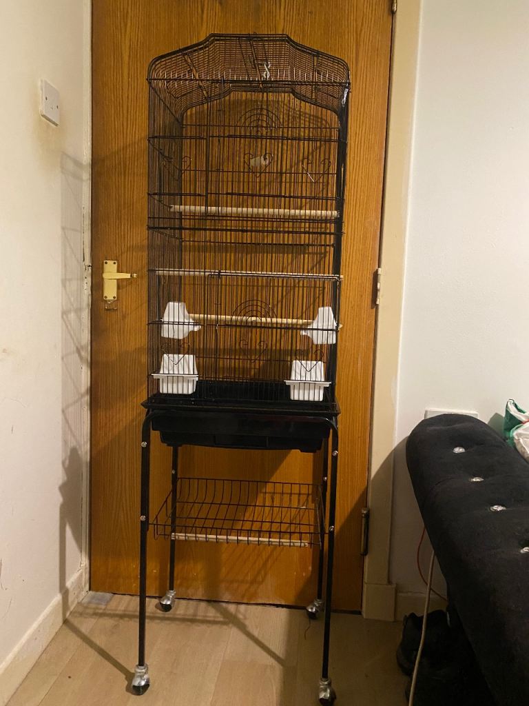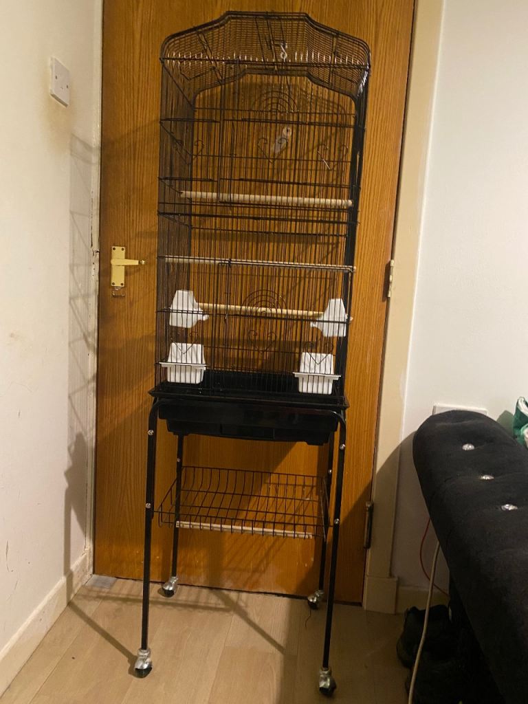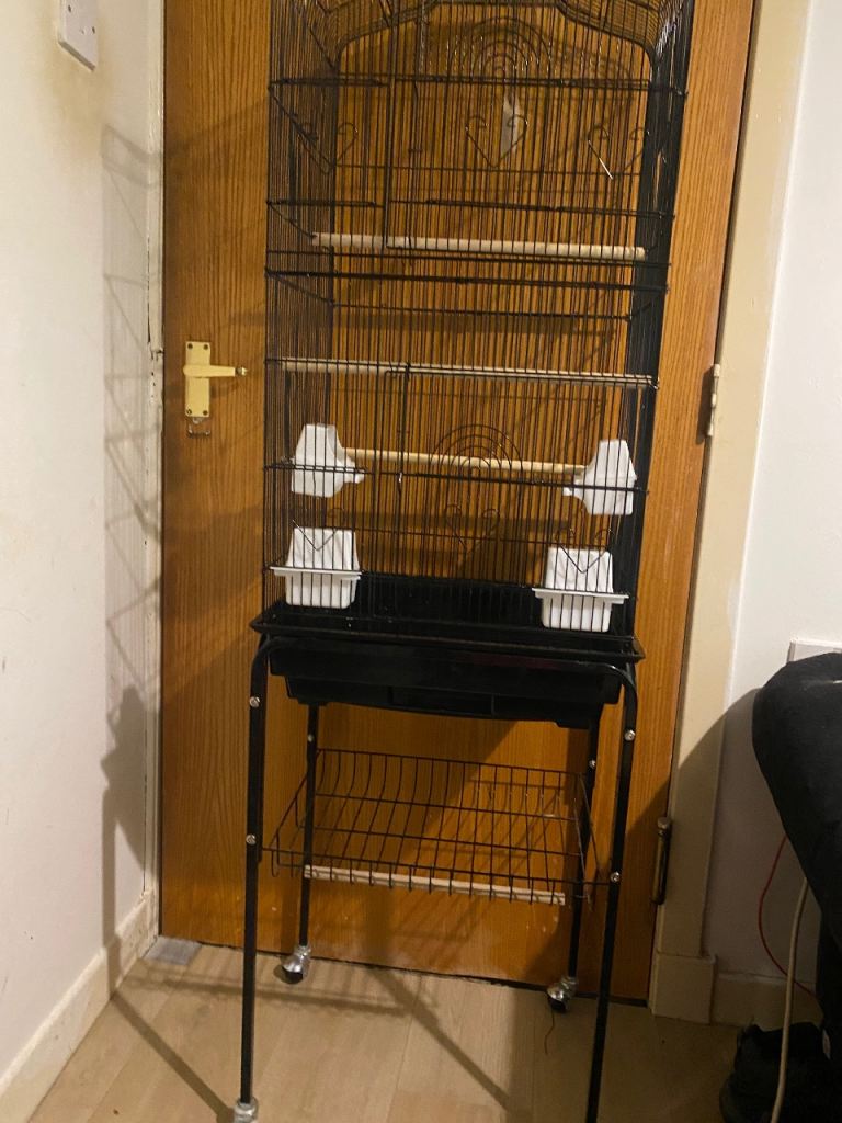 Large bird cage on stand with wheels with loads a extras inc brand new cage and easy &40 a extras inc perches n chews n toys n treats as seen in photos