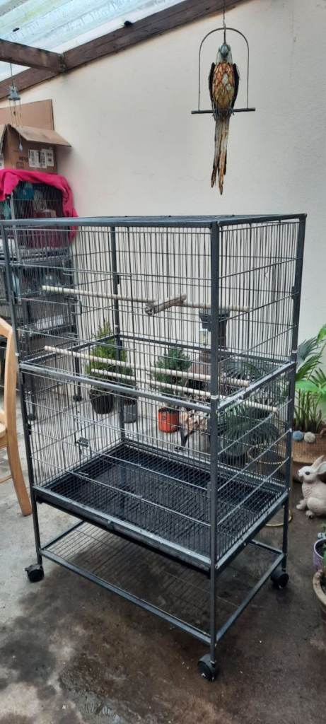 Very good condition. On wheels and has removable tray at bottom for easy cleaning. Perches and feeder trays included. All measurements are in pictures. Cage iteslf is light and easily moved. Perfect for smaller parrot types/ love birds/budgies etc. Or a colony of finches etc.