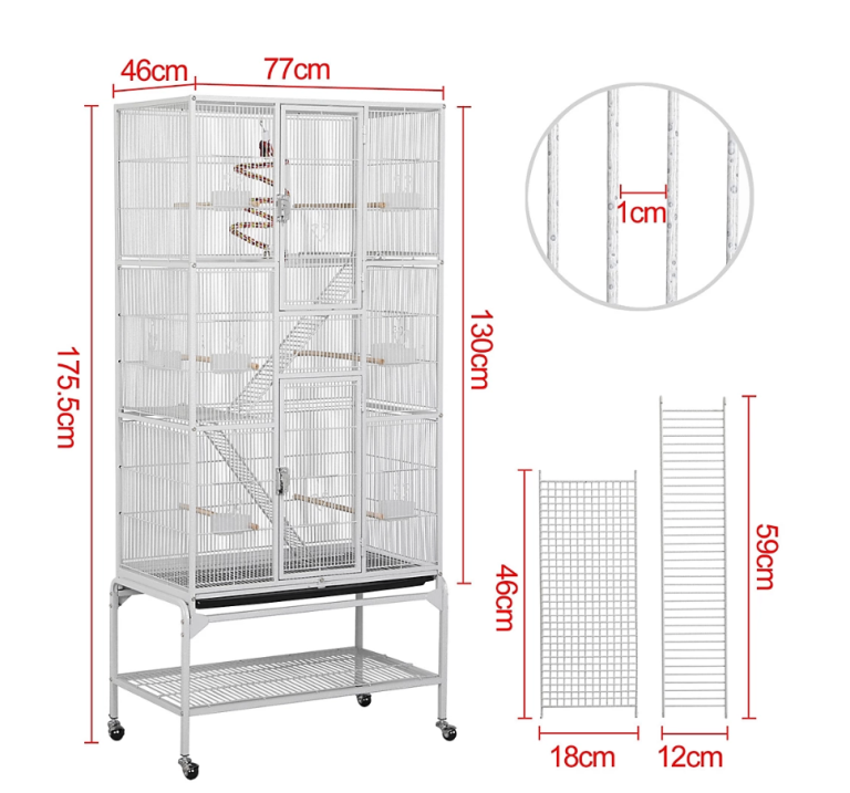 Designed for birds but also worked really well for a pair of rats. The cage is approximately 77cm x 46cm x 128cm. It's 176cm to the floor.