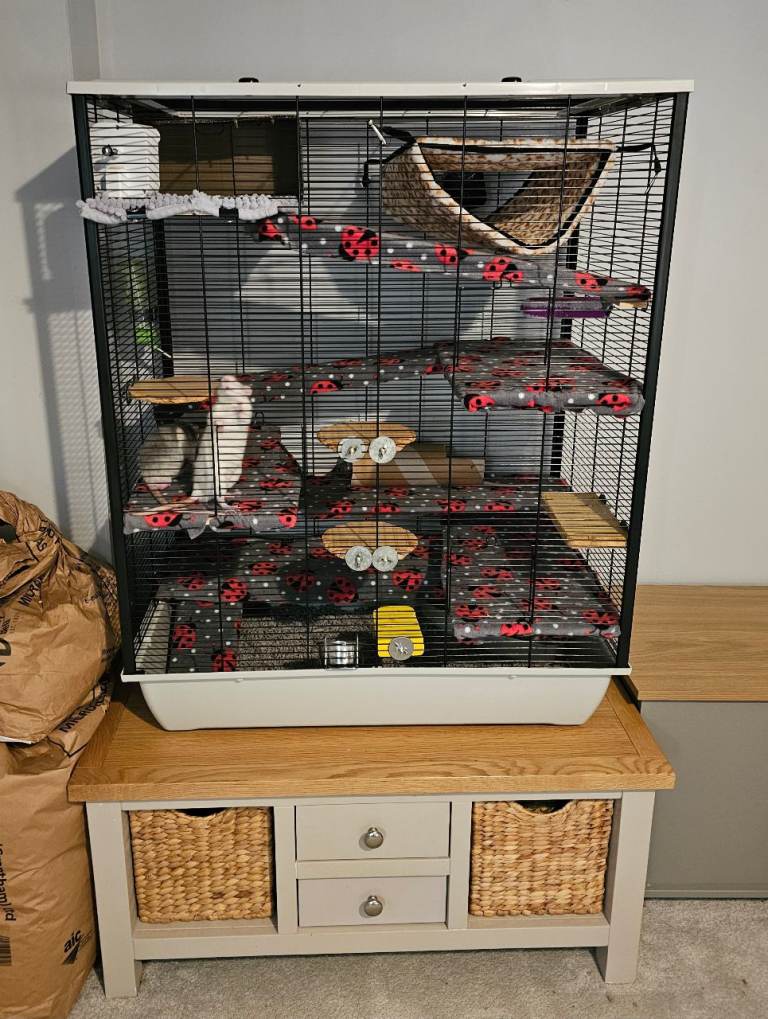 Large cage suitable for rats, hamsters, Degu and other small animals. Comes with multiple levels, ladders, shelves, water bottles, litter tray and some fleece liners if required. 3 doors on the front plus top door opens up.