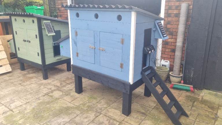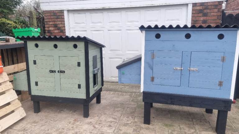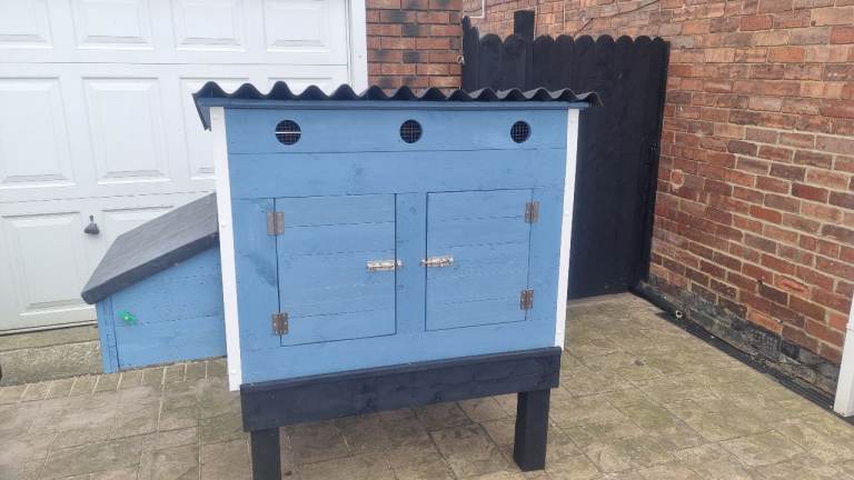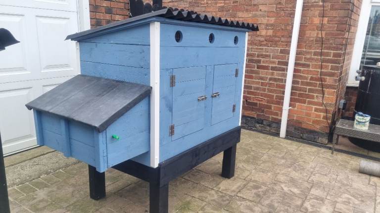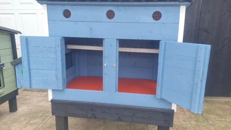 The coop is built with 22mm thick wood and painted inside and out with waterproof pet friendly paint.