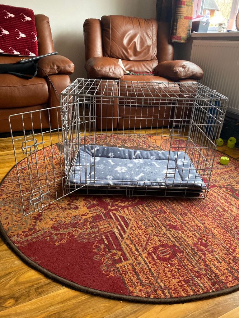 Large dog crate recently purchased from pets at home. Dog didn’t like it hence sale. Very little use, sizes: 76cm (30”) x width 48cm(19”) x 54 cm (21 1/4”). 2x doors.