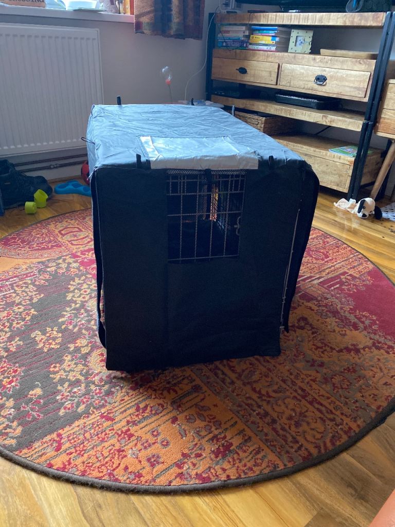 Posting for 8+ yearsLarge Dog crate with mat and cover