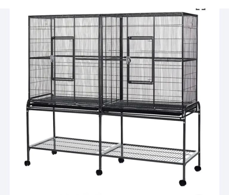 This spacious cage is ideal for small birds, with a dual-compartment design, secure bar spacing, and pull-out trays for easy cleaning.
